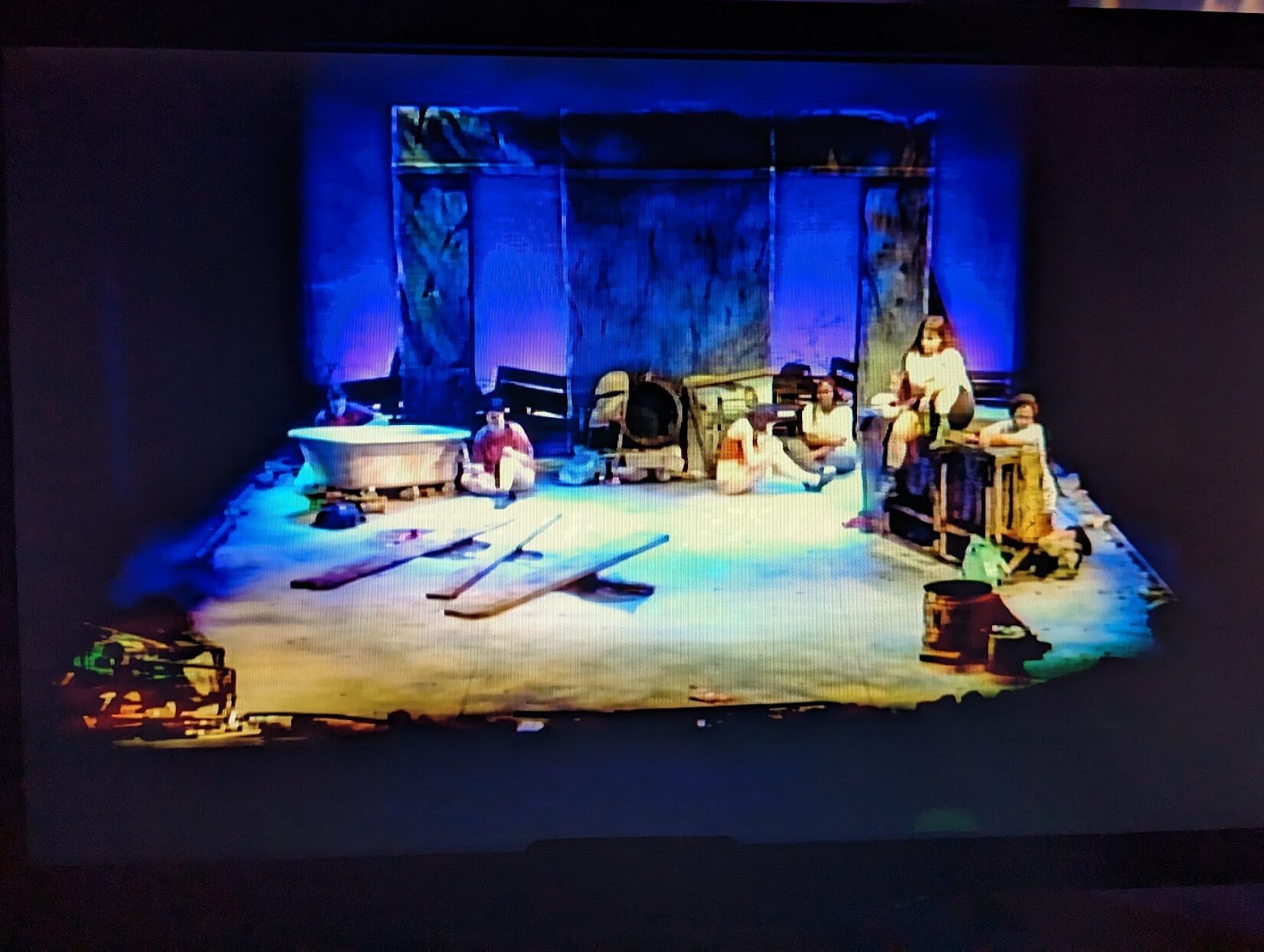 This set was built in proscenium on a rake and was a large, roughly 22′ x 22′ platform with a large wall at the back of the set with two doorways. I helped with the construction of the platform, the wall, and the rain and gutter systems. The raked platform was built out of 4′ x 8′ stock platforms covered with layers of Visqueen, sound board, and then the whole platform was covered with muslin. This show necessitated the construction of a rain rig, which I helped make with PVC pipes and sprinkler heads. We also built a gutter system at the front edge of the stage that ran into a barrel under the stage in the orchestra pit. The back wall was constructed with hard cover flats which we then covered over with 3″ thick foam and deteriorated with acetone to emulate eroded concrete.