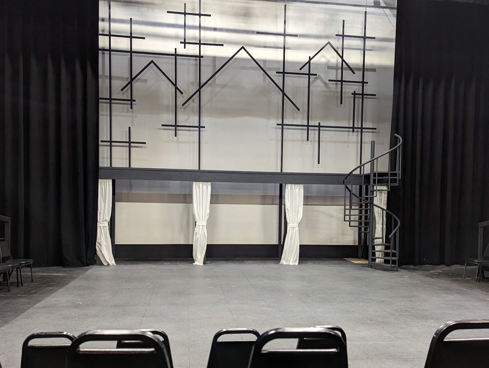 This set was constructed as a 3/4 thrust with a 2′ x 20′ platform at the back of the stage which was 8′ tall. I assisted in the construction of the platform, the backdrop, which was made of steel and plywood, and I also retrofitted the spiral staircase on the right with two additional steps at the top, fabricated out of 16 gauge steel.