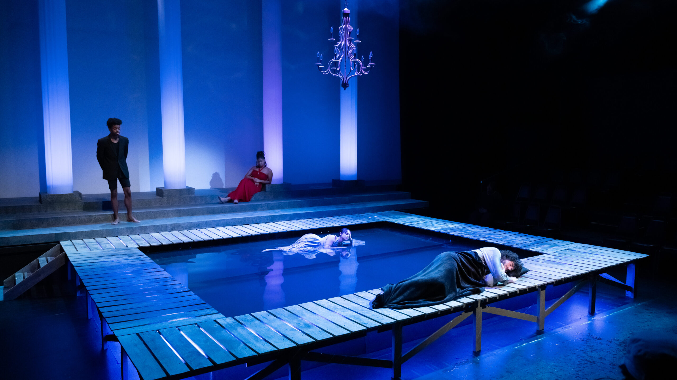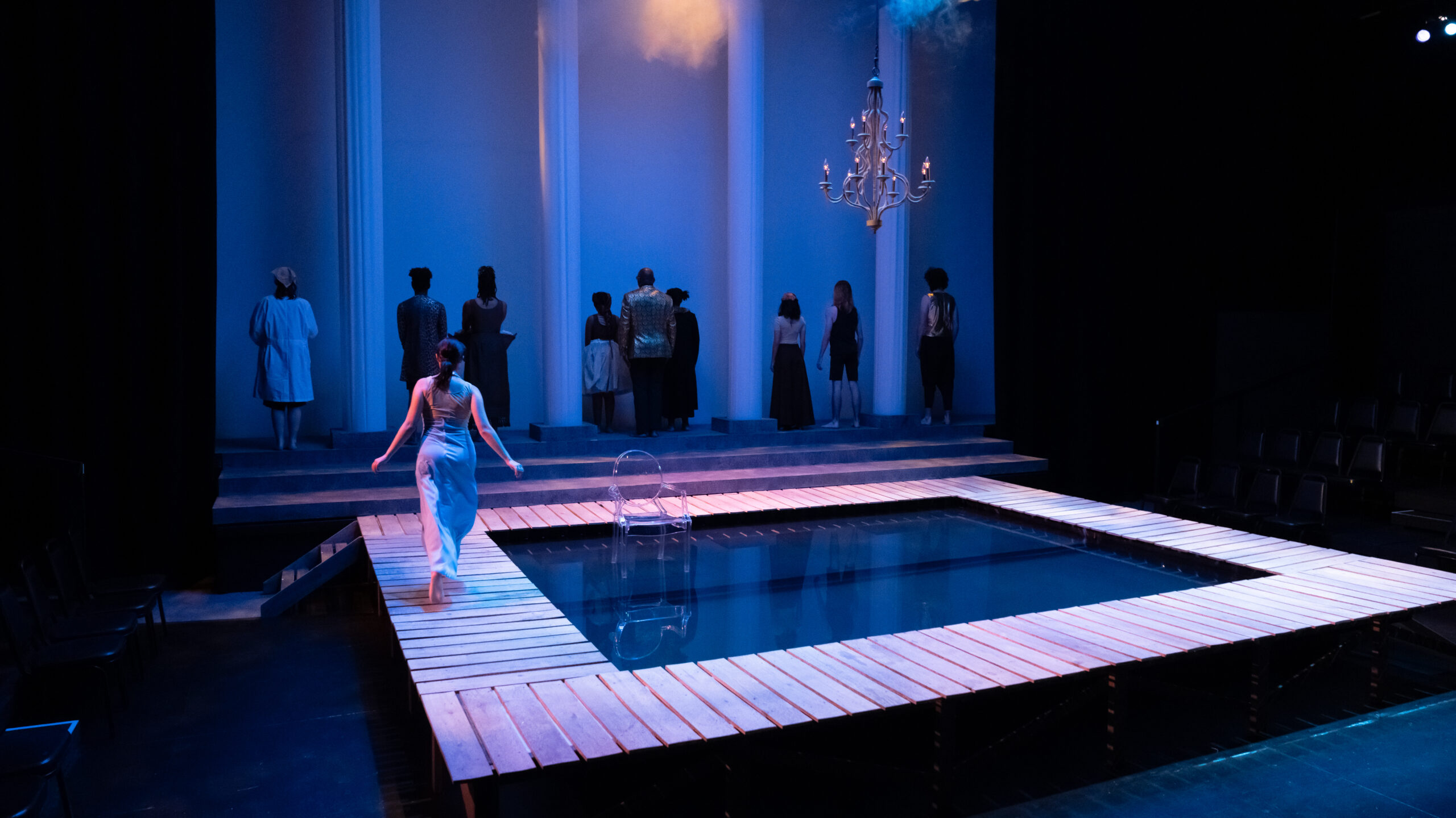 I was the head carpenter for this production of Metamorphoses. The set consisted of a large pool of water enclosed by four 2×4 stud walls which I built, faced with OSB and covered with sound board, packing blankets, and pool liner. The pool had two levels, one shallow side at ~6″ and a deeper side at ~18″. The boardwalk is made with individual fence boards, with a trapdoor built into the furthest upstage walkway. The back three levels are individual platforms. The columns are 16′ tall tubes of muslin with 3/4″ plywood circles on either end for rigging and for mounting LED lighting instruments to. There are also lights mounted underneath the boardwalks.