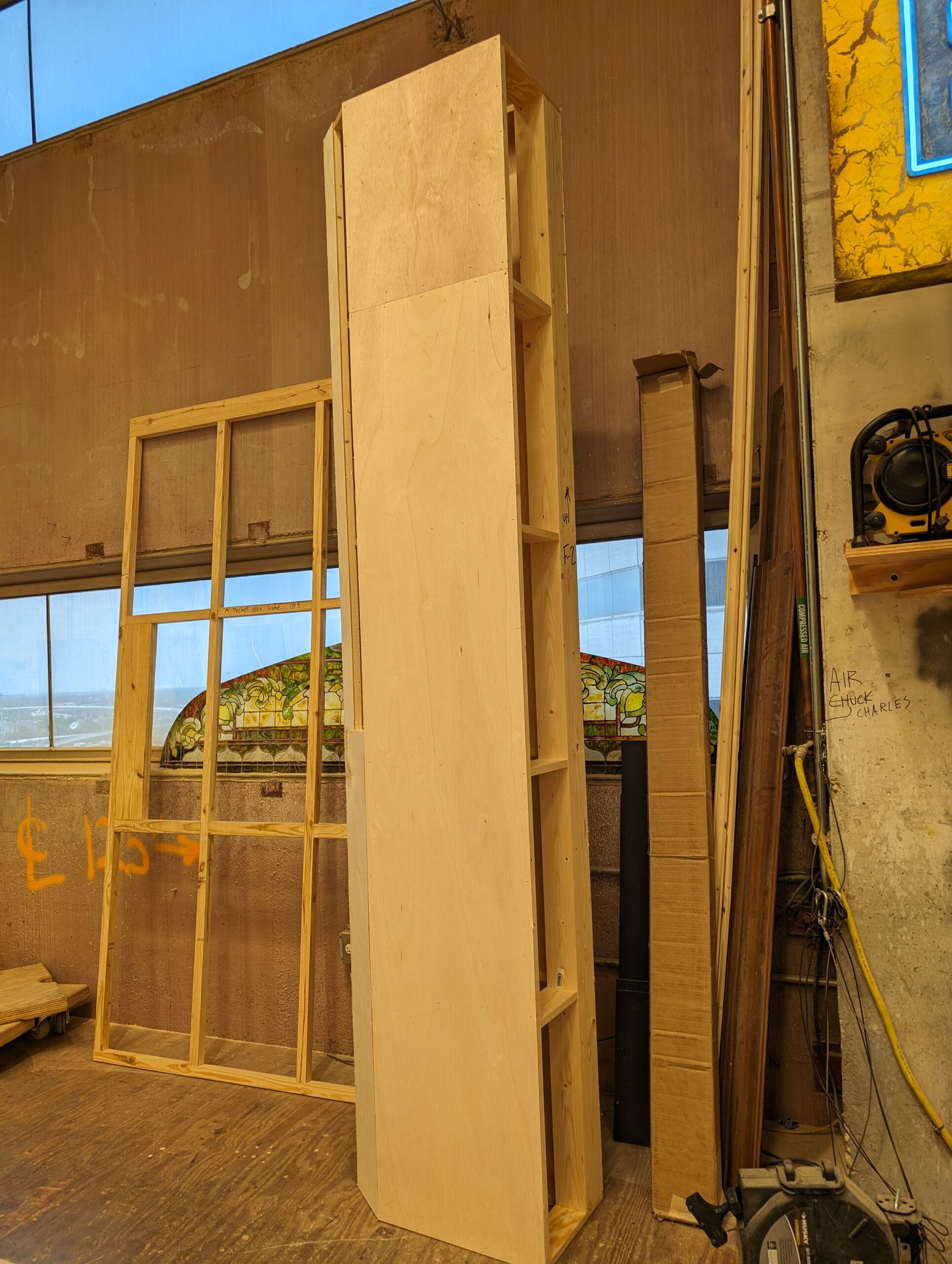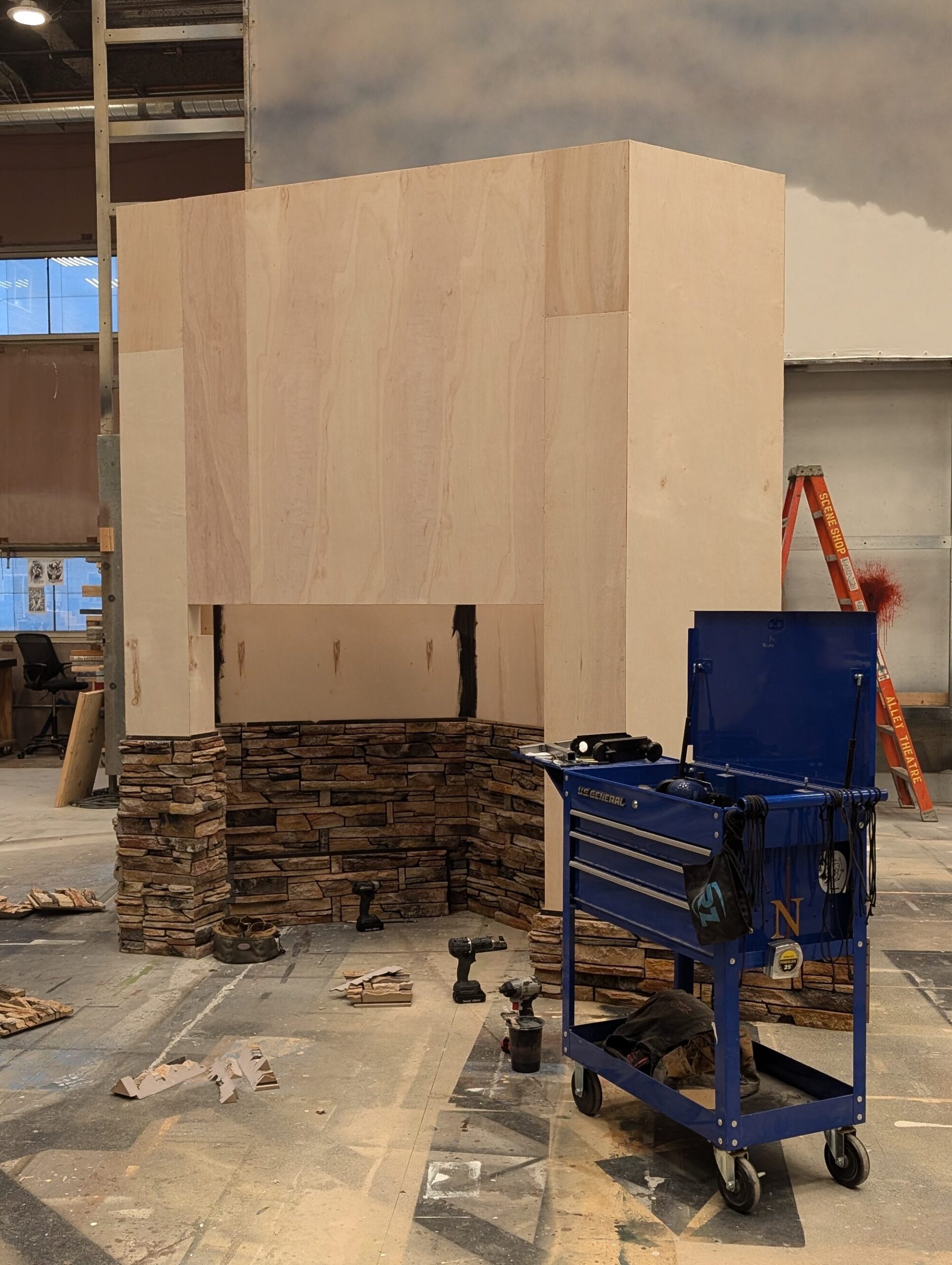 This set was built in 3/4 thrust, entirely framed out of 2×4, with the exception of the mantle in the center and the cross piece at the top of the roofline, which were both made of 2×6. I helped build all of the framing and did repairs on stock furniture.