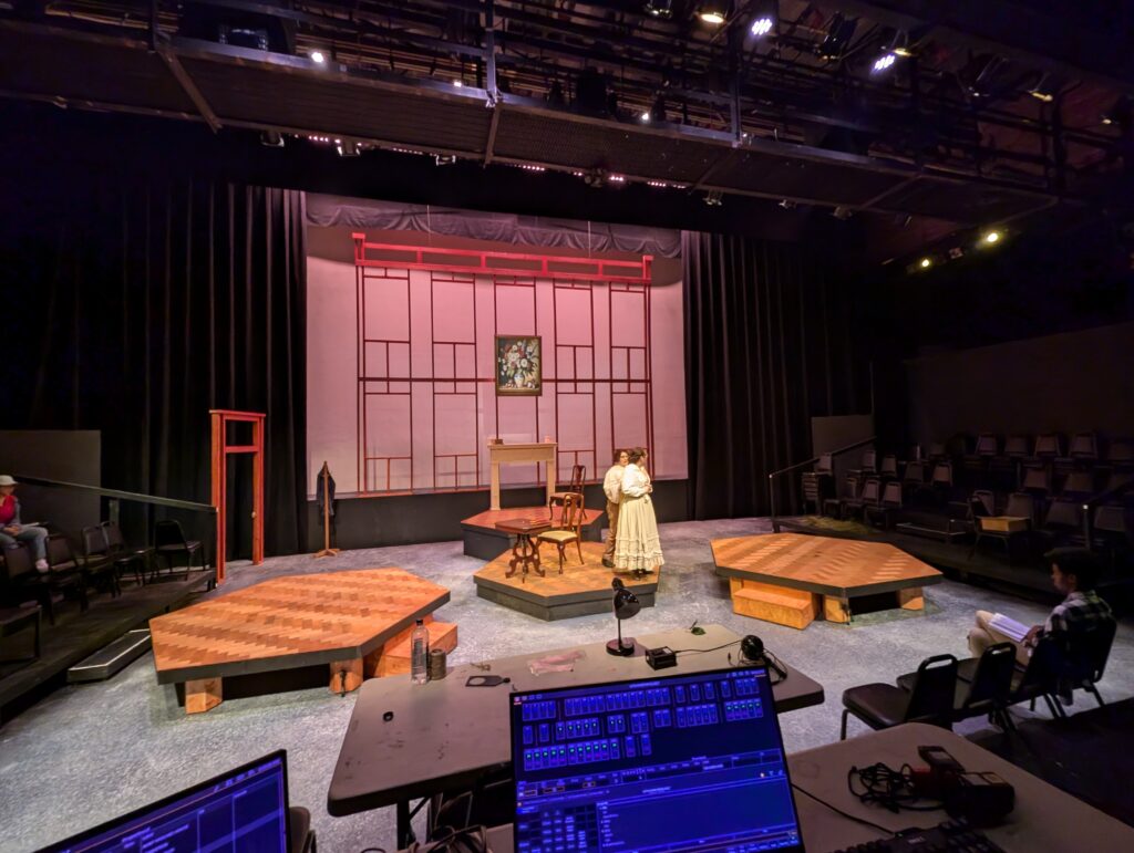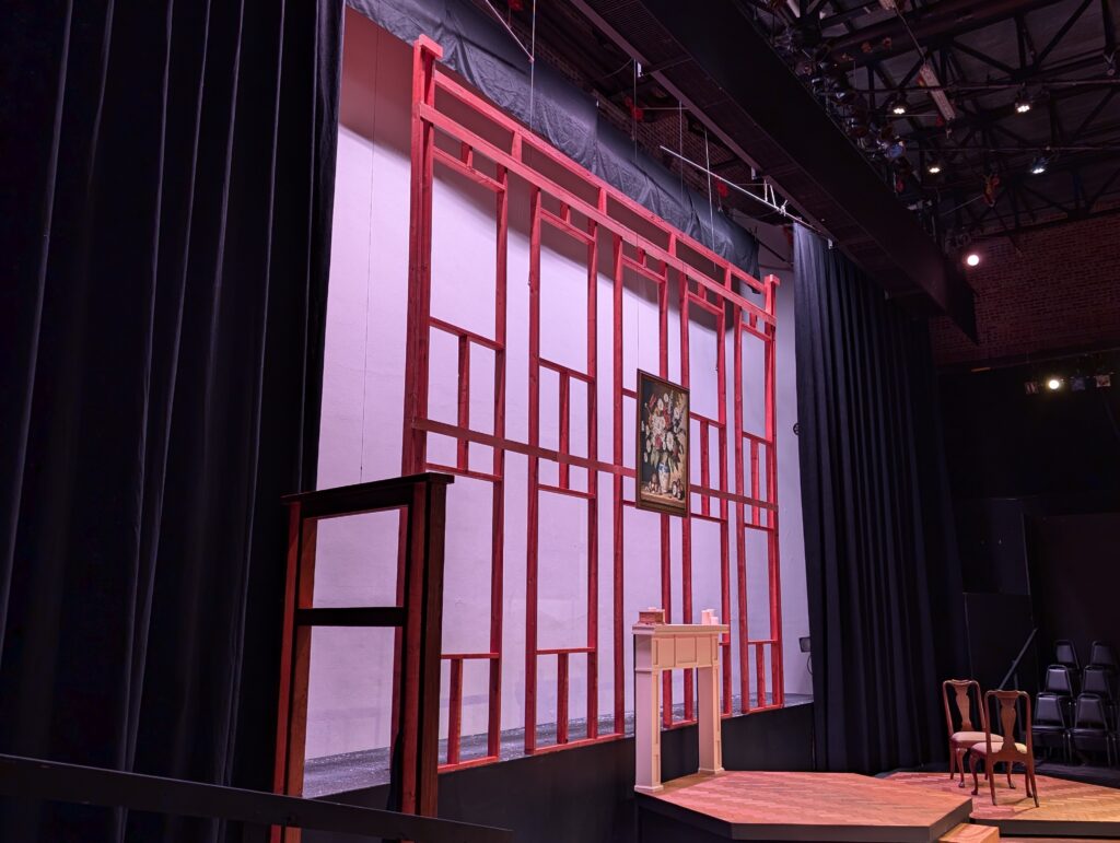 I was the associate scenic designer and head carpenter for this production. The four hexagonal platforms were made of stock 4×8 platforms that we built triangular wings for. Two of the platforms are on wheels and spin and move up and down stage. The parquet flooring on the platforms was made from individual luan tiles stapled to a sacrificial sheet of masonite to save time during strike, and the floor and background framing were stained instead of painted. I designed and drafted in AutoCAD the background house framing.