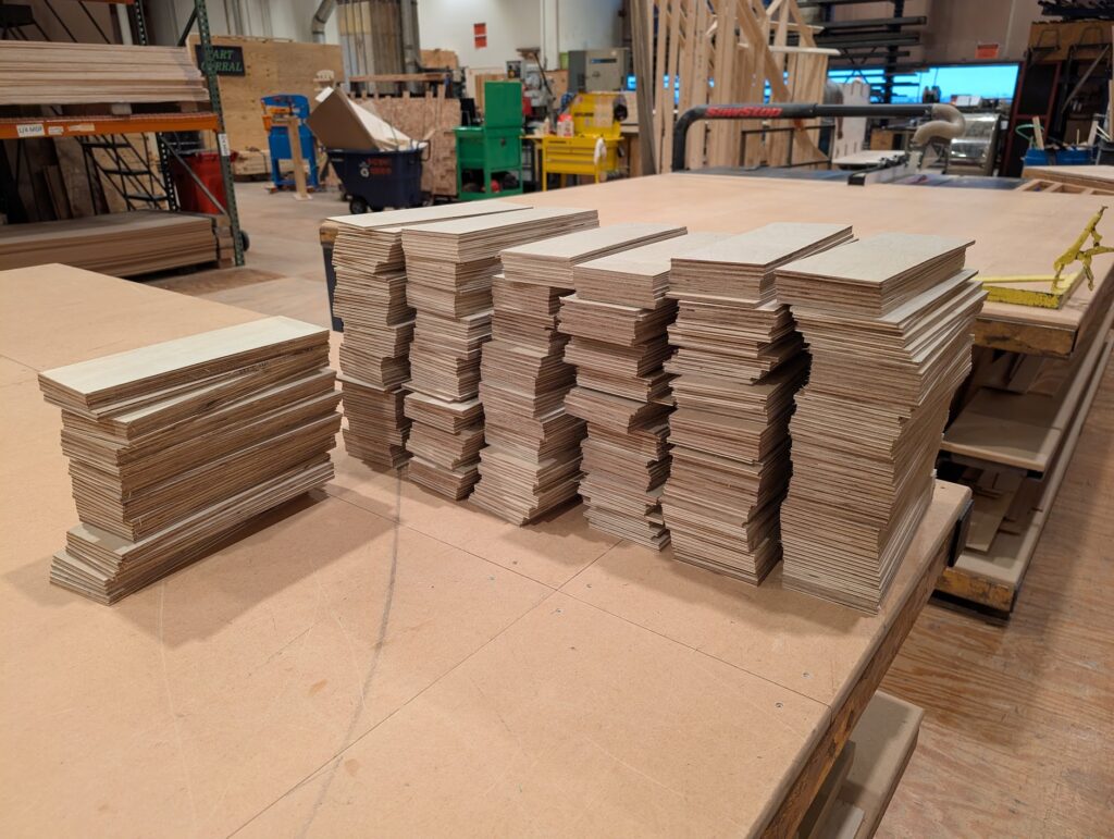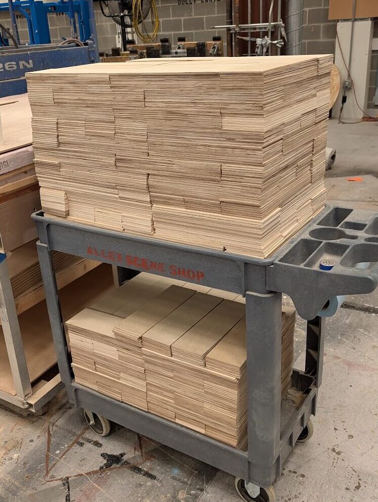 Processed and individually sanded 16 sheets of birch plywood into roughly 1600 parquet floor tiles for an upcoming production of The Glass Menagerie.