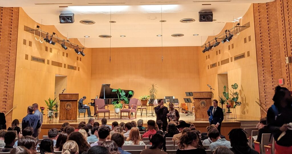 This stage design was for the presentation of a literary award in the Anderson Choral Building at Centenary College. The organizers of the event wanted room for a piano and orchestra at the back and two lecterns at the front on either side. The author being presented the award, Aimee Nezhukumatathil, had written a book with a lot of themes of nature and wildlife, so they also wanted lots of greenery, as well as a cozy-feeling seating area for an interview segment.