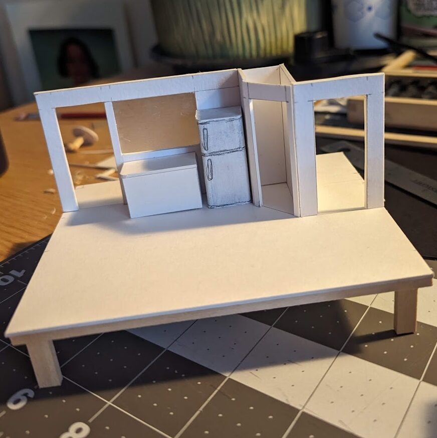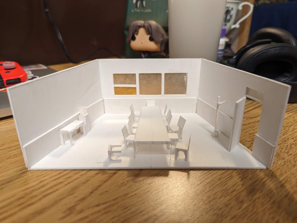 This is a white model of a scenic design for Twelve Angry Men created as an assignment for one of my professors.