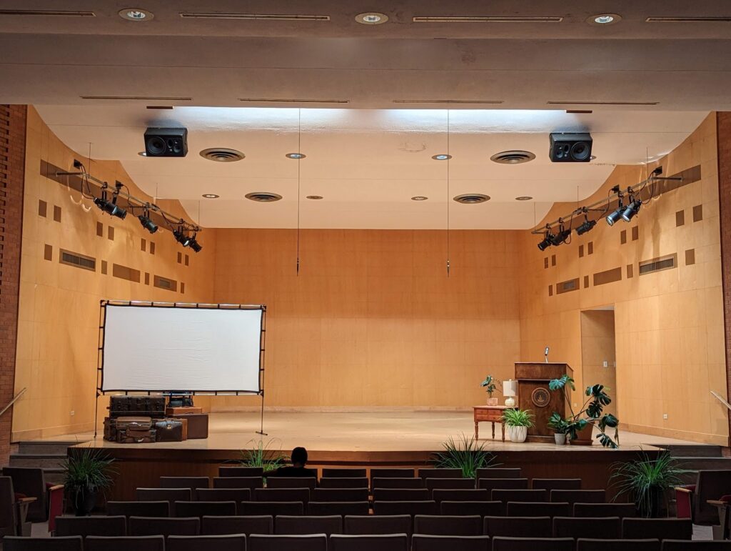 This stage design was for a presentation by Dr. Kodjo Adabra about his journey from Africa to America, presented in the Anderson Choral Building at Centenary College. The professor organizing the event wanted one side of the stage to represent Africa and leaving home, and the other side to represent making a new home in America. To accomplish this, I placed a stack of suitcases and trunks, both old and newer, on one side, and on the other, where Dr. Adabra would be speaking, a side table with a lamp and lots of plants because Dr. Adabra discusses his garden at home in his presentation. The empty space was necessary for a short dance performance, and the screen on the left had images and video back-projected onto it.