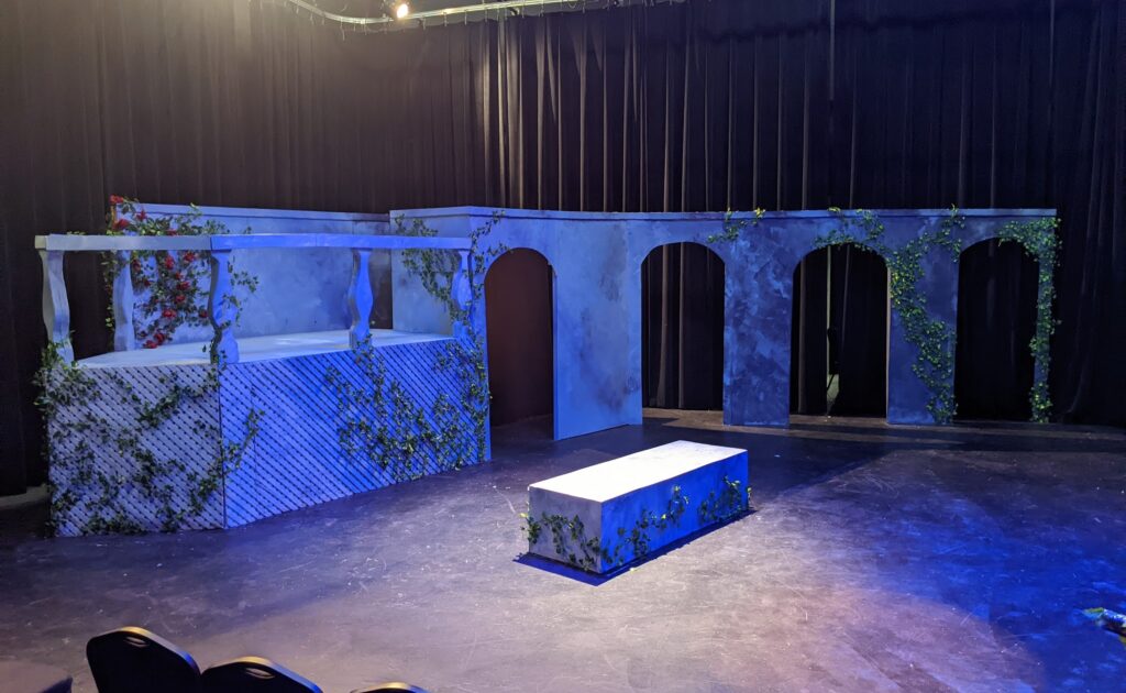 I designed this set for Taylor High School’s production of Romeo and Juliet, which was performed in a blackbox with seating on two sides. I helped in building the set and I painted and dressed the set myself. The design was meant to represent an old and slightly overgrown castle, while also emulating a graveyard or mausoleum.